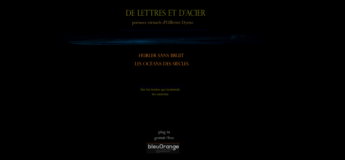 « ''Est-il possible, en utilisant un poème comme point de départ, de créer un territoire de l’imaginaire humain/machine? Ce territoire peut-il être émouvant? Peut-on y examiner la relation de l’humain à la machine? Nous permet-il d’apprivoiser le non-humain, le non-organique?'' Voilà les questions auxquelles Ollivier Dyens, par son œuvre De lettres et d’acier, tente de répondre. Présentée pour la première fois dans le cadre de la soirée bleuOrange 00, le 28 mars 2008, cette œuvre place l’internaute devant une ville créée de toutes pièces et composée de poèmes d’auteurs qui, majoritairement, ont vécu ou vivent à Montréal. Les poèmes choisis, provenant de la plume de Naïm Kattan, Dany Laferrière, Hélène Dorion, Cécile Cloutier et plusieurs autres, tapissent les édifices translucides d’un Montréal stylisé (tel qu’affirmé par l’artiste et professeur lors de la présentation de l’oeuvre). L’internaute est invité à naviguer dans l’un des deux univers en trois dimensions (VRML) présentés, à savoir Hurler sans bruit ou bien Les océans des siècles. Le premier présente un paysage aux allures hivernales, par ses couleurs froides et sa musique d’ambiance plutôt sombre, alors que le second présente un paysage estival, où les jaunes, les verts et les rouges se côtoient pour constituer une atmosphère plus chaleureuse. Les déplacements de caméra dans ce second poème virtuel sont aussi beaucoup plus dynamiques que dans le premier. »