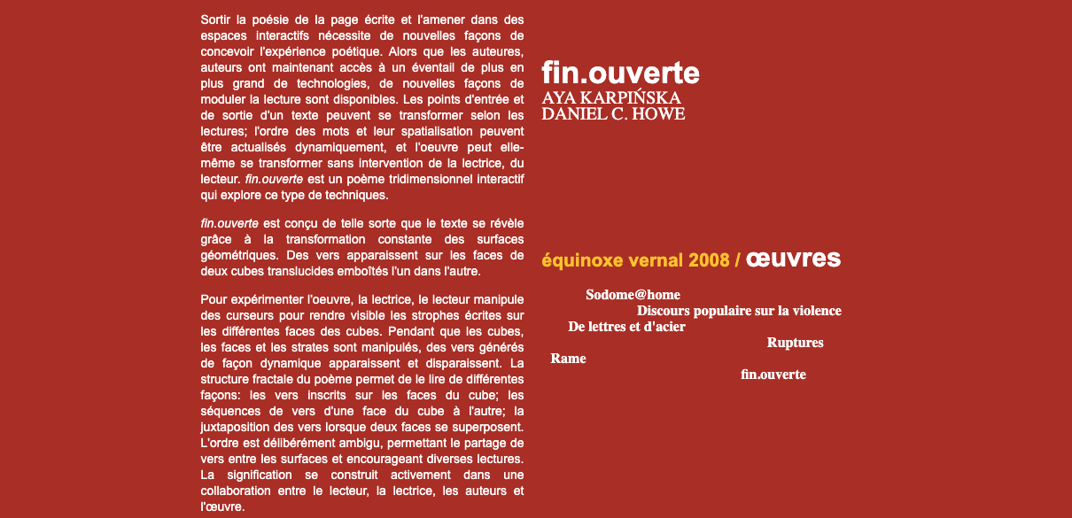 Leonardo Electronic Almanac, numéro spécial New Media Poetics, https://www.leoalmanac.org/journal/vol_14/lea_v14_n05-06/LEA_v14_n05-06.html (lien mort)