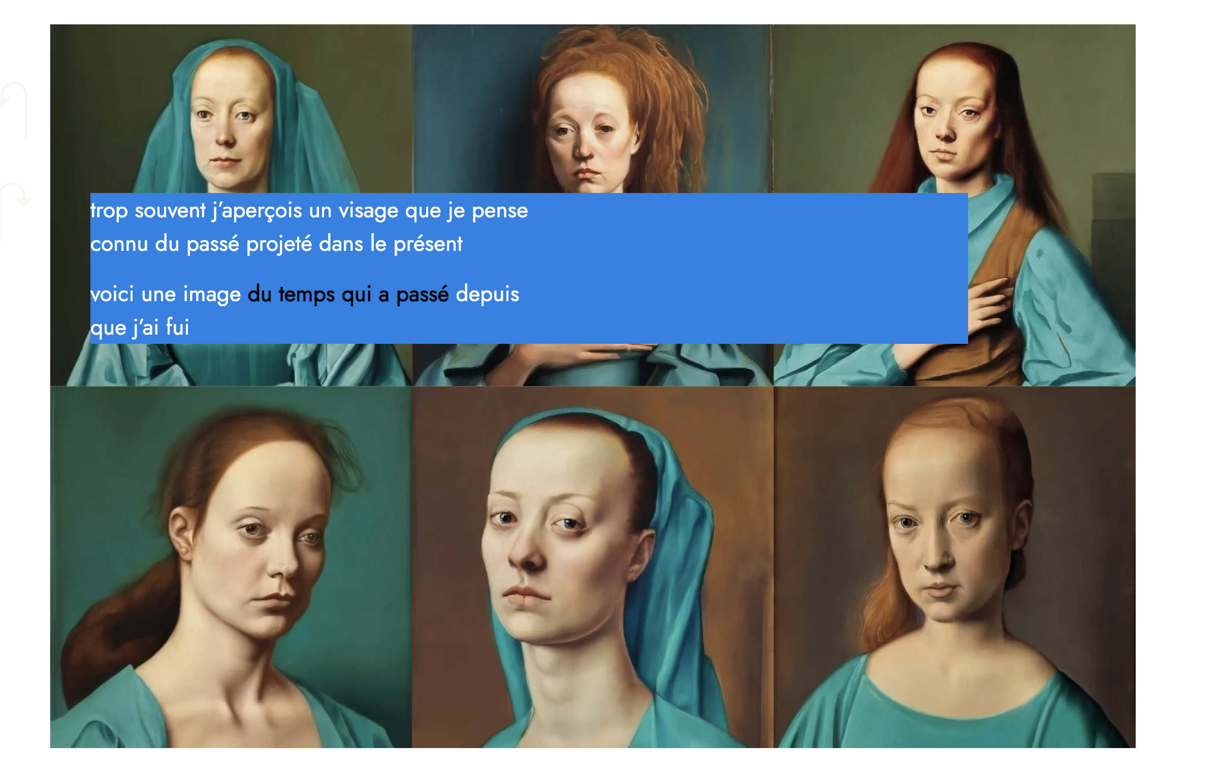 Le triptyque s'ouvre sur une œuvre où des poèmes, en rouge sur blanc et associés à différents visuels produits par générateur, évoquent la possible ou impossible invention de soi. Les vers se parsèment de mots cliquables menant à de nouveaux textes ou permettant de retourner en arrière. La deuxième proposition, qui reprend le même principe d'interaction, change d'esthétique visuelle en s'approchant de la peinture, dans une forme de dramatisation de la fin du monde qui est cette fois thématisée par le texte; celui-ci dessine un doute quant à la possibilité d'un à-venir. « 3/3 mais nous délie enfin » poursuit l'apposition de textes et d'images, mais se concentre cette fois sur le portrait, la filiation, le passé choisi. Tout au long du triptyque, les hyperliens donnent accès à de nouvelles propositions texte-image, mais débouchent à quelques reprises sur des sites externes ou sur des impasses où les vers disparaissent, notamment lorsqu'on parle explicitement de « silence ». Bien que chaque partie du triptyque puisse se lire distinctement des autres, il émerge de l'ensemble un questionnement évolutif sur la notion d'embranchements (possibles, fuites, retours, ouvertures) et son rôle dans la constitution de l'identité.