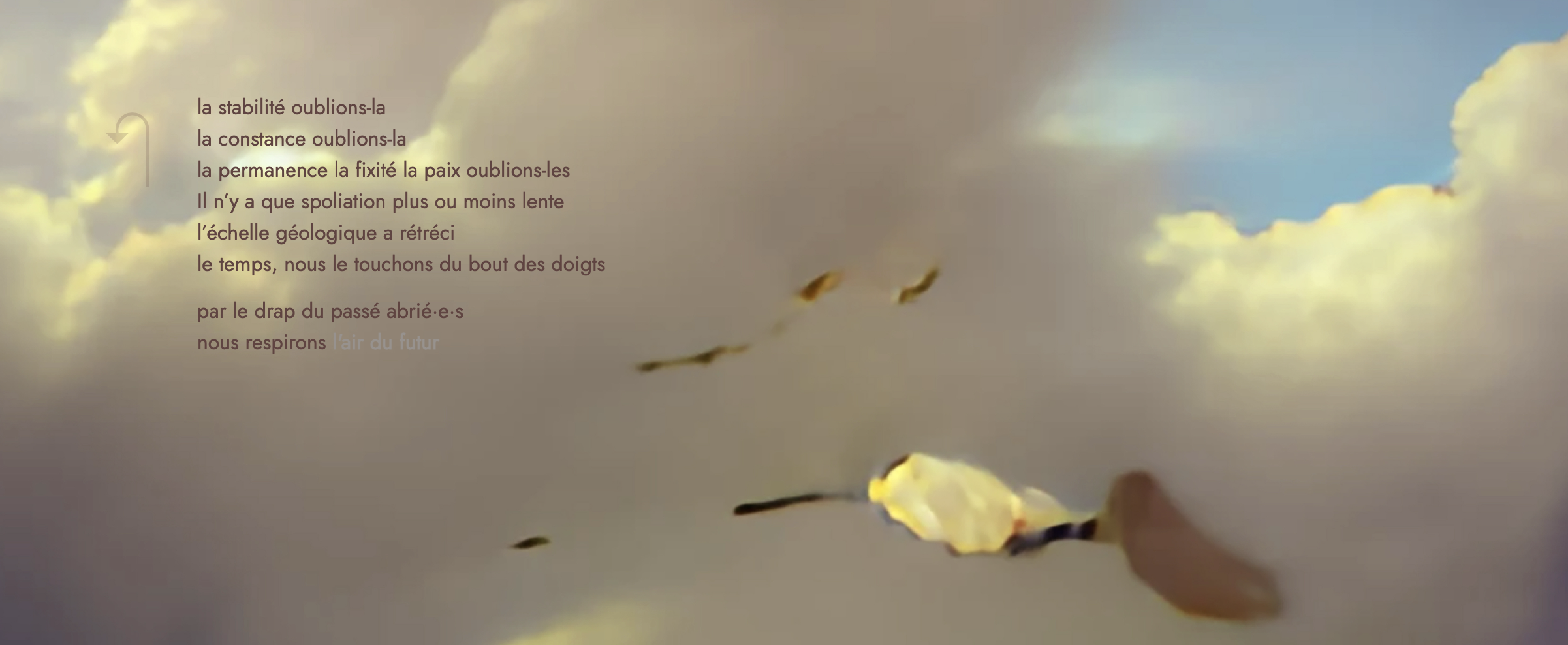 Dans ce deuxième parcours poétique proposé par Laurence Olivier, la voix n’hésite plus mais contemple plutôt différents embranchements de la pensée, qui se présentent sous forme d’hyperliens. Aux idées envahissantes de fin du monde s’opposent cette fois-ci des possibles : la possibilité d’un retour en arrière, la possibilité d’essayer de nouvelles avenues, et celle, peut-être, d’alléger la pensée.