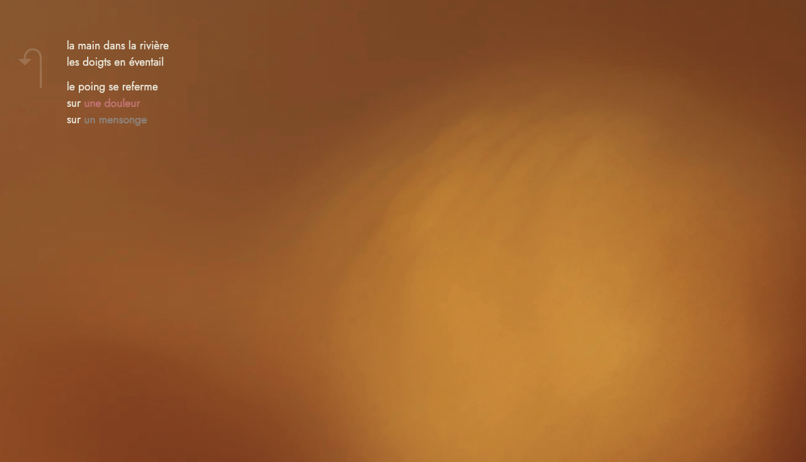 Deuxième volet d'un triptyque de littérature hypermédiatique associant les poèmes de Laurence Olivier et les oeuvres visuelles de l'artiste multidisciplinaire Nathalie Bujold, ce projet est le résultat d'une résidence virtuelle effectuée au sein de la revue Moebius.