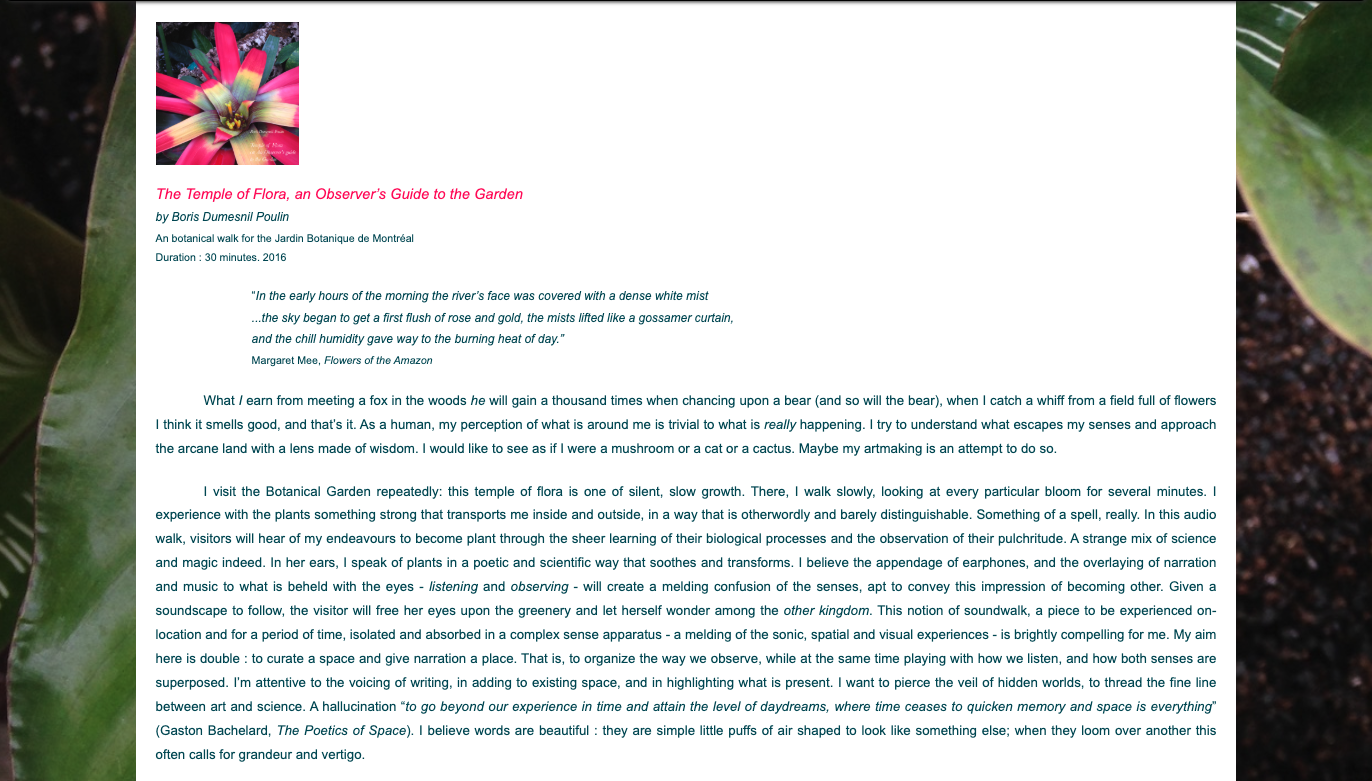 Le site présente des photos de l'auteur au jardin botanique et de spécimens qu'on y trouve. En-dessous, une description de l'oeuvre et un dossier contenant des fichiers audio. Ceux-ci servent de trame sonore et narrative à celles et ceux qui veulent suivre le parcours de l'auteur au Jardin botanique de Montréal, trajet illustré par une carte au bas de l'écran.